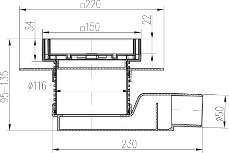 Floor drain-low with side outlet D50, collar, stainless steel frame, grid CERAMICS 150