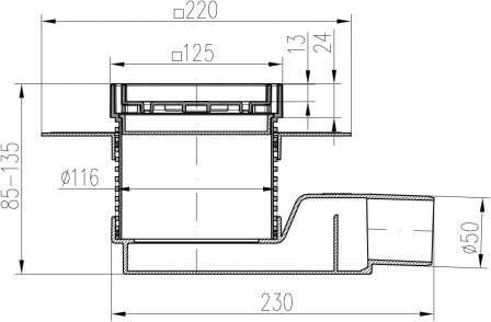 Floor drain-low with side outlet D50, collar, stainless steel frame, grid CERAMICS 125