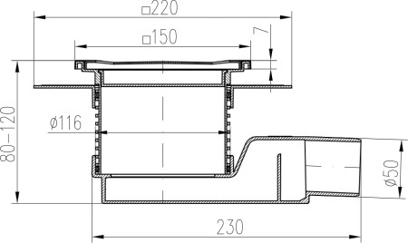 Floor drain-low with side outlet D50, collar, full stainless steel frame, grid SUN
