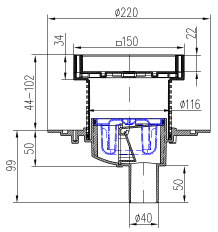 Floor drain with bottom outlet D40, stainless steel frame, grid STEEL 150