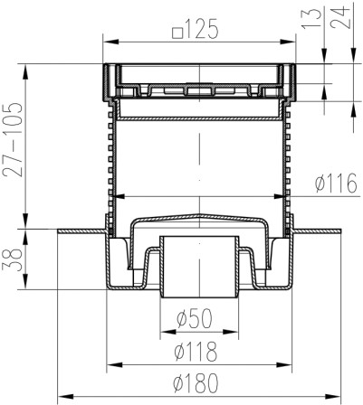 Floor drain with bottom outlet D50, collar, stainless steel frame, grid CERAMICS 125