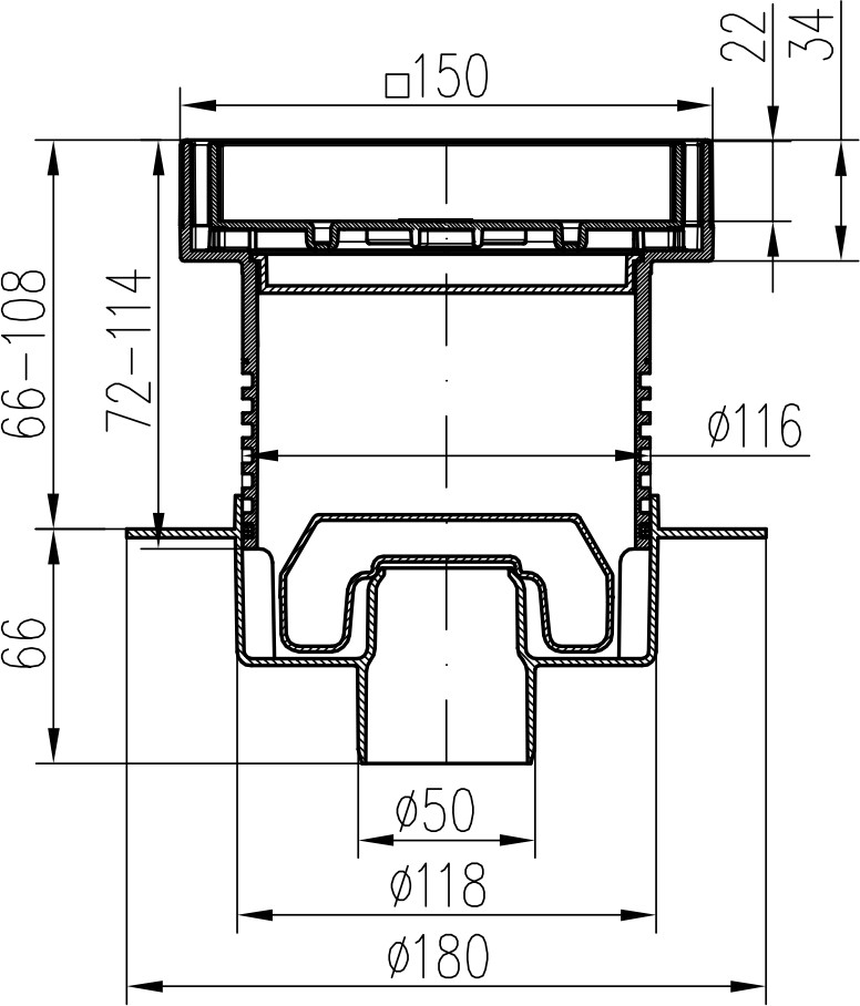 Floor drain with bottom outlet D50, NEPTUN, collar, stainless steel frame, grid CERAMICS 150