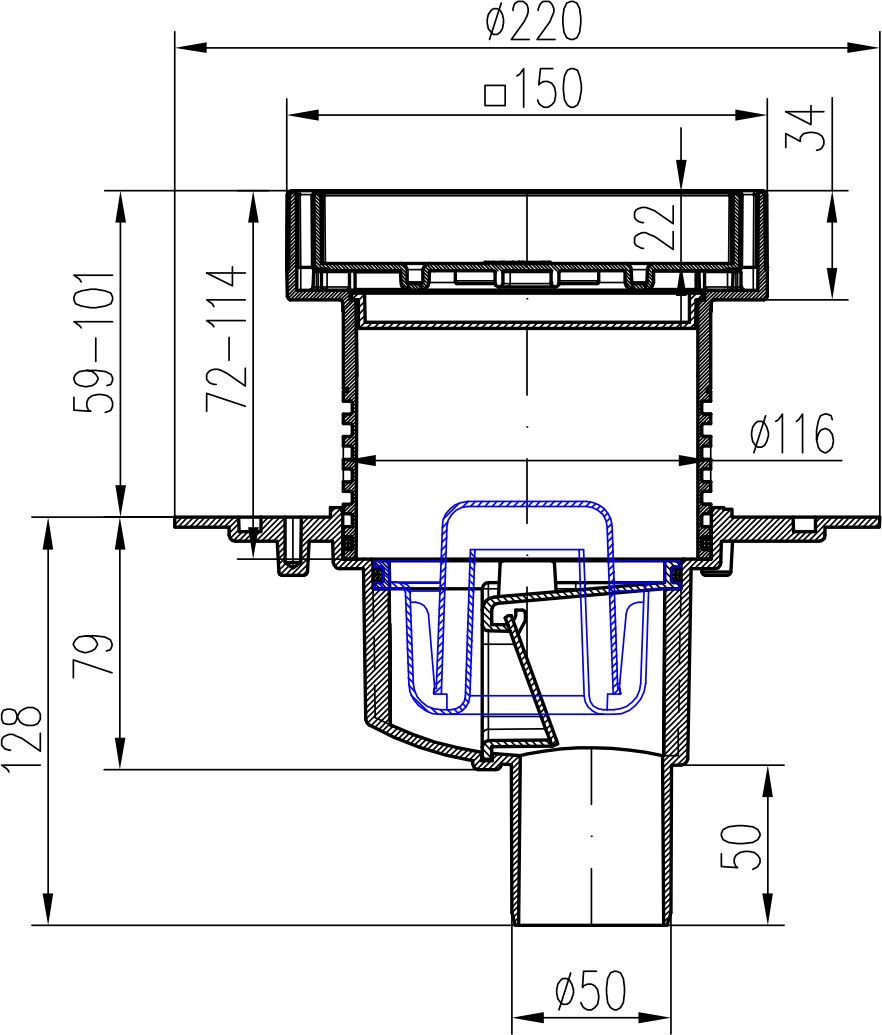 Floor drain with bottom outlet D50, stainless steel flange, frame, grid STEEL 150