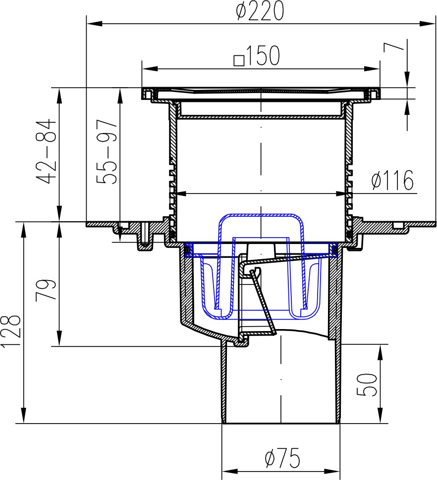 Floor drain with bottom outlet D75, stainless steel frame, grid SUN 150