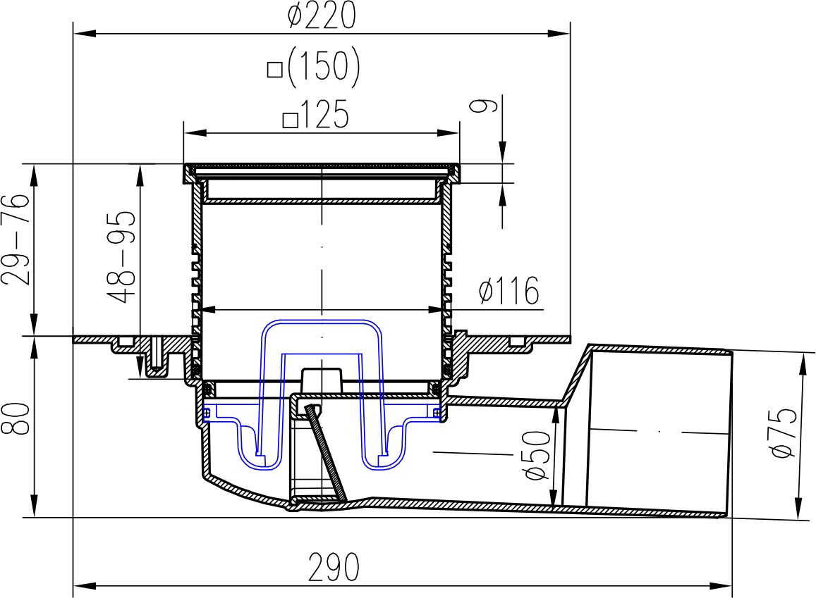 Floor drain with side outlet black D50/75, stainless steel flange, grid SUN black