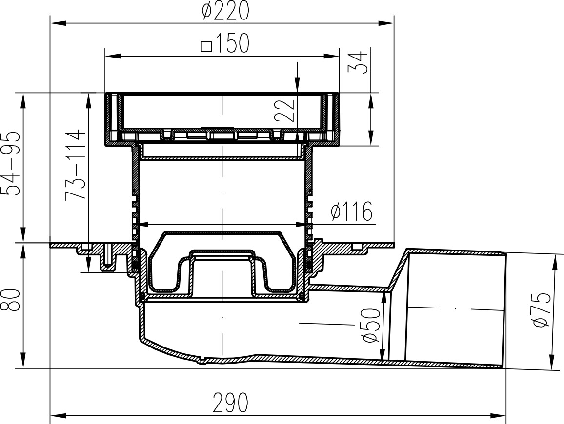 Floor drain with side outlet D50/75, NEPTUN, stainless steel frame, grid CERAMICS 150