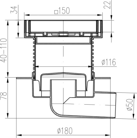 Floor drain with side outlet D50, collar, stainless steel frame, grid STEEL 150