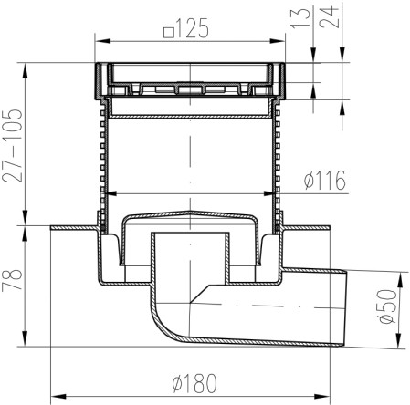 Floor drain with side outlet D50, collar, stainless steel frame, grid STEEL 125