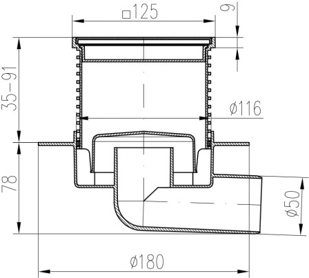 Floor drain with side outlet D50, collar, stainless steel grid LABYRINTH 125