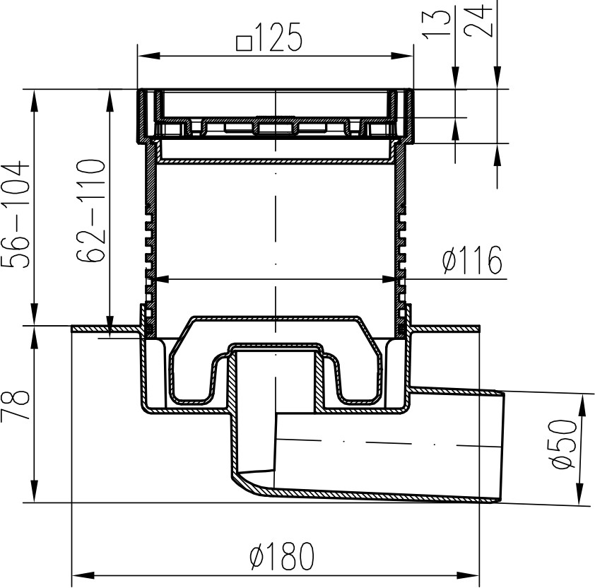 Floor drain with side outlet D50, NEPTUN, collar, stainless steel frame, grid CERAMICS 125