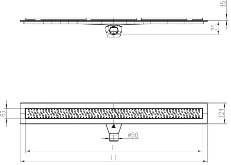 Linear floor drain black 850mm with side outlet D50 and swivel siphon 360°, Line grid black