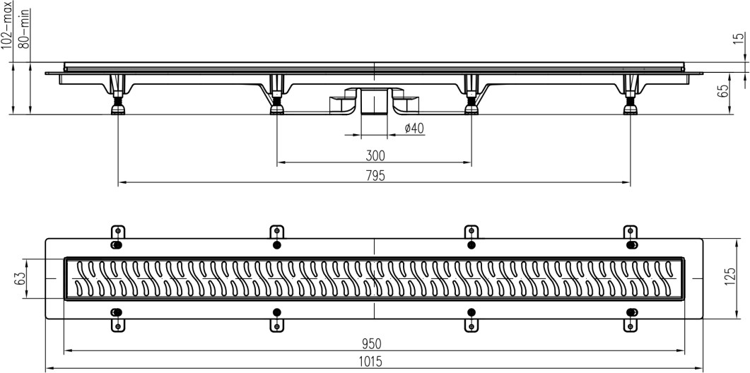 Linear floor drain black, bottom outlet D40, 950 mm, Line grid black