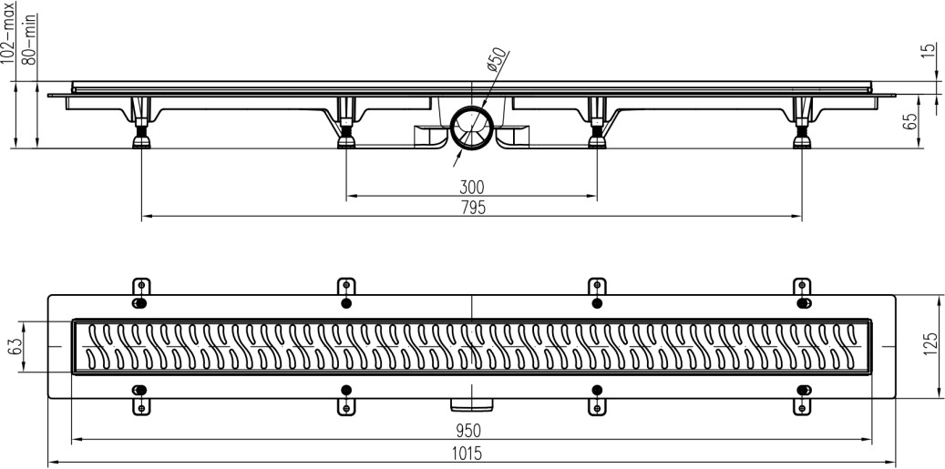 Linear. floor drain, side outlet D50, 950 mm, Line grid matt