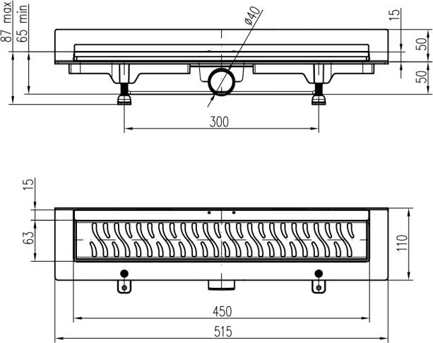 Linear. floor drain to wall black side outlet, D40, 450 mm, Square grid black