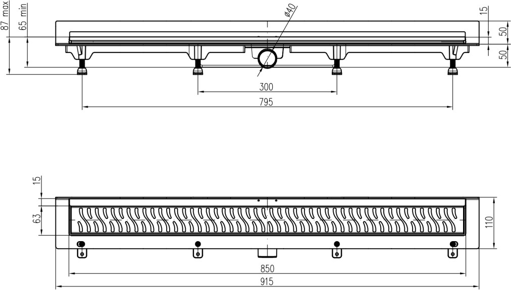 Linear. floor drain to wall side outlet, D40, 850 mm, Klasik grid matt