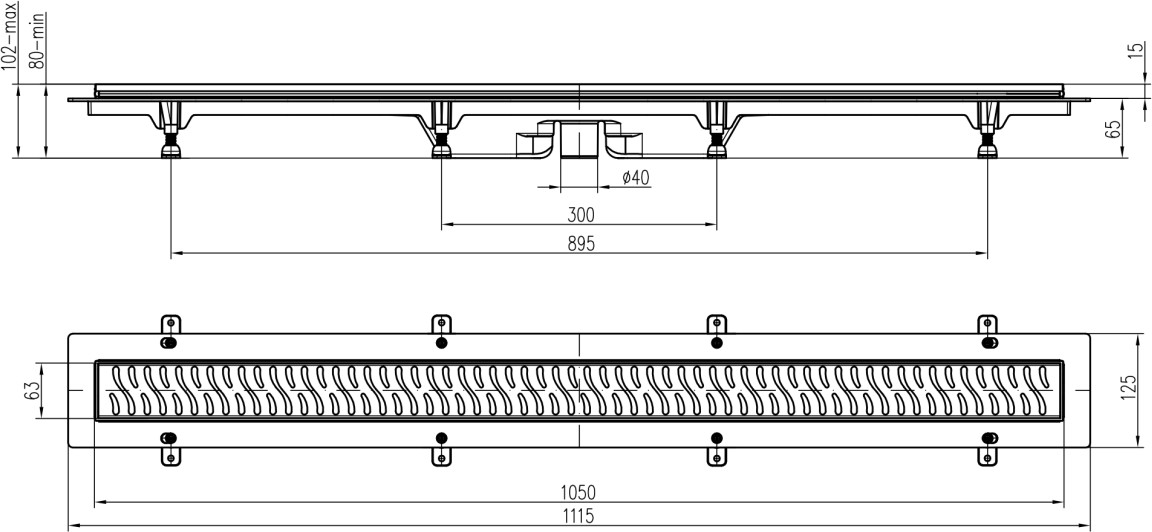 Linear. floor drain with stainless steel frame, 1050 mm, bottom outlet, D 40, Medium grid matt