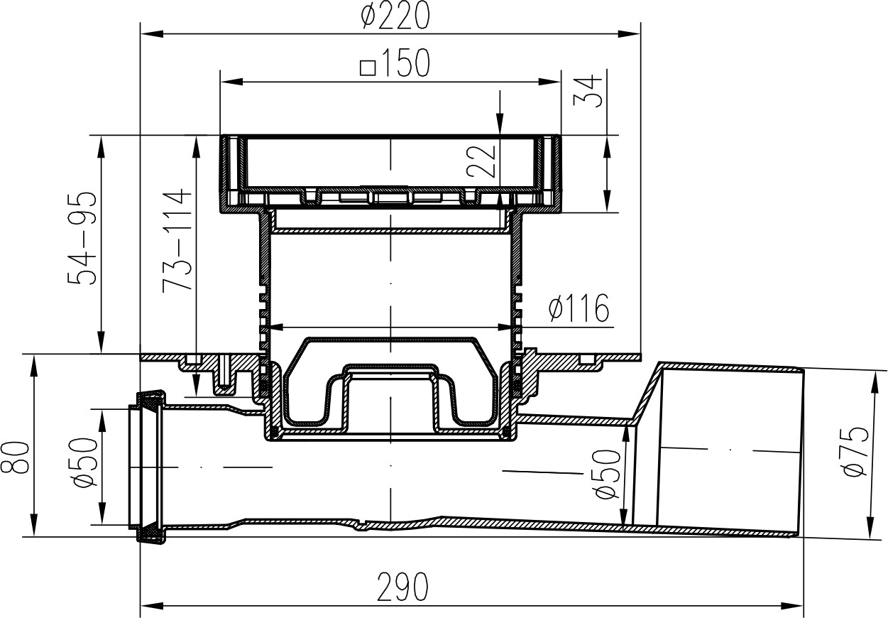 Multi-inlet floor drain, side outlet D50/75, NEPTUNE, stainless steel frame, grid CERAMICS 150