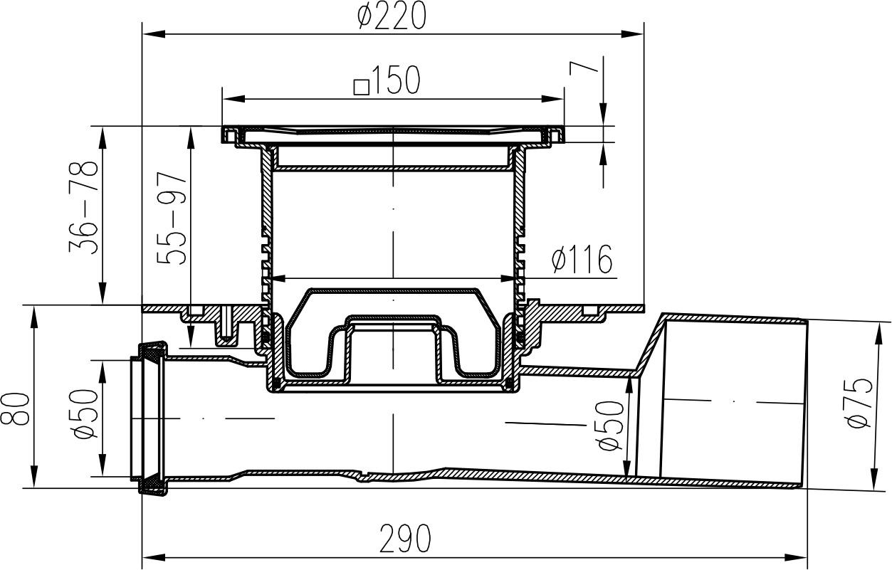 Multi-inlet floor drain, side outlet D50/75, NEPTUNE, stainless steel frame, grid SUN
