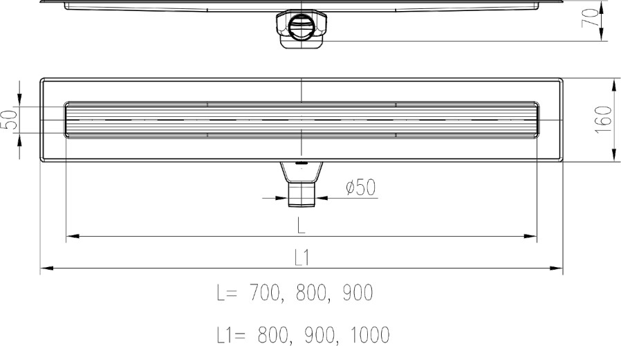 Stainless steel linear floor drain, 900mm, swivel side siphon D50, stainless steel plate