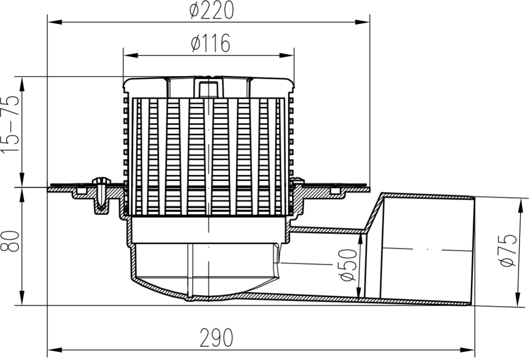Terrace drain with side outlet D50/75, stainless steel flange