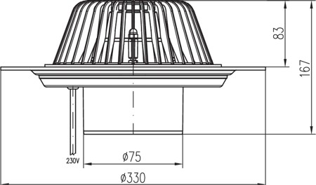 The gravity roof drain is designed for the drainage of rainwater from flat roofs in accordance with the EN 1253 standard. The upper inlet basket prevents debris from entering the drain. In the Vortex SVG 004 version, a self-regulating heating cable with an output of 10 W is included in the package to prevent the roof drain from freezing.